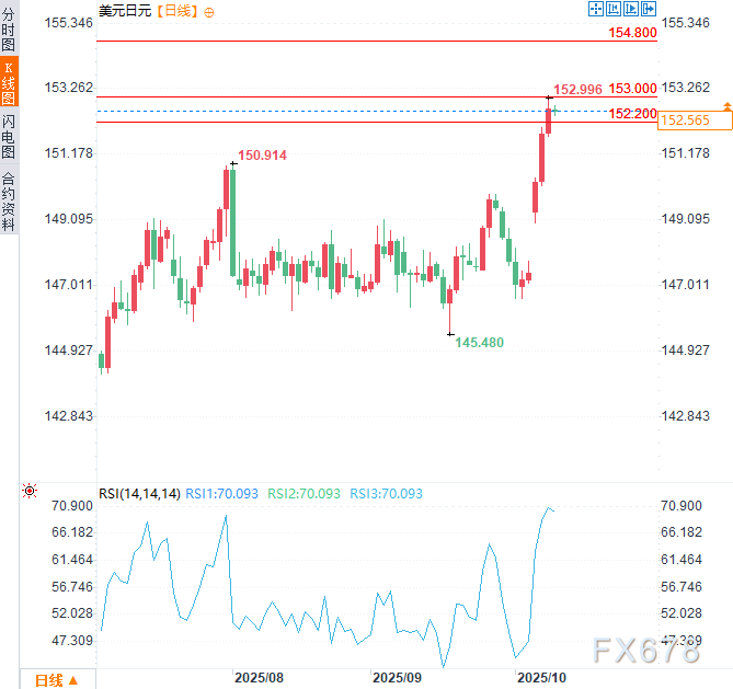 (美元兑日元日线图,来源:易汇通)北京时间10:15,美元兑日元交投于152.52/53。